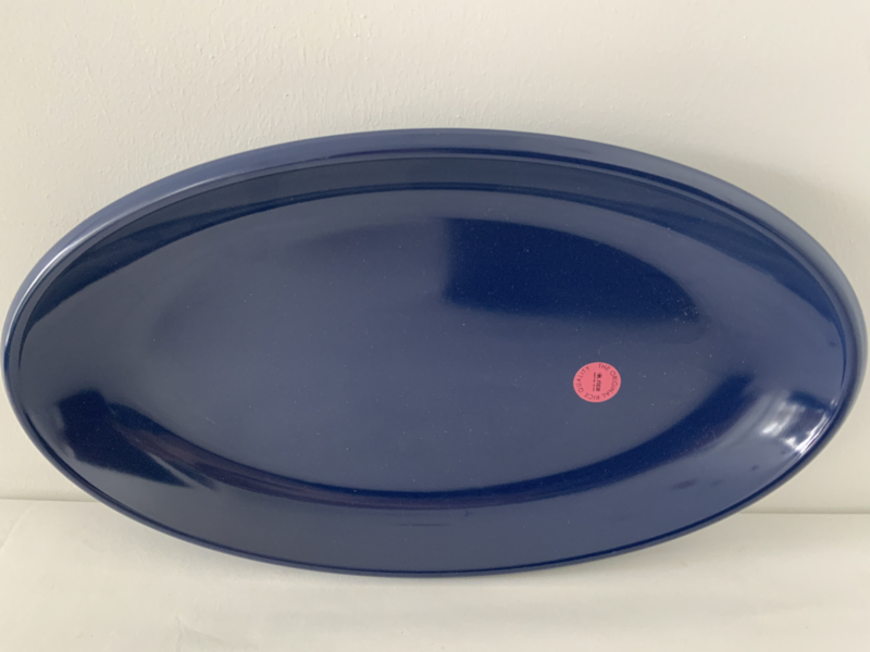 Een prachtige serveerschaal van het praktische materiaal melamine. De ovale schaal zal elke eettafel opfleuren met zijn prachtige donkerblauwe kleur... maar het staat ook mooi met een kandelaar of een vaas met je favoriete bloemen erop. De schaal is 20,5 cm breed, 35,0 cm lang en 3,5 cm hoog. Hij is ook te verkrijgen in large.